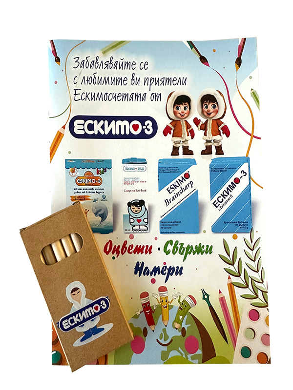 С всяка поръчка на ESKIMO-3 Kids сироп или ESKIMO-3 Kids желирани таблетки получавате подарък – моливи и книжка за оцветяване! За една поръчка може да бъде получен максимум един подаръчен комплект.