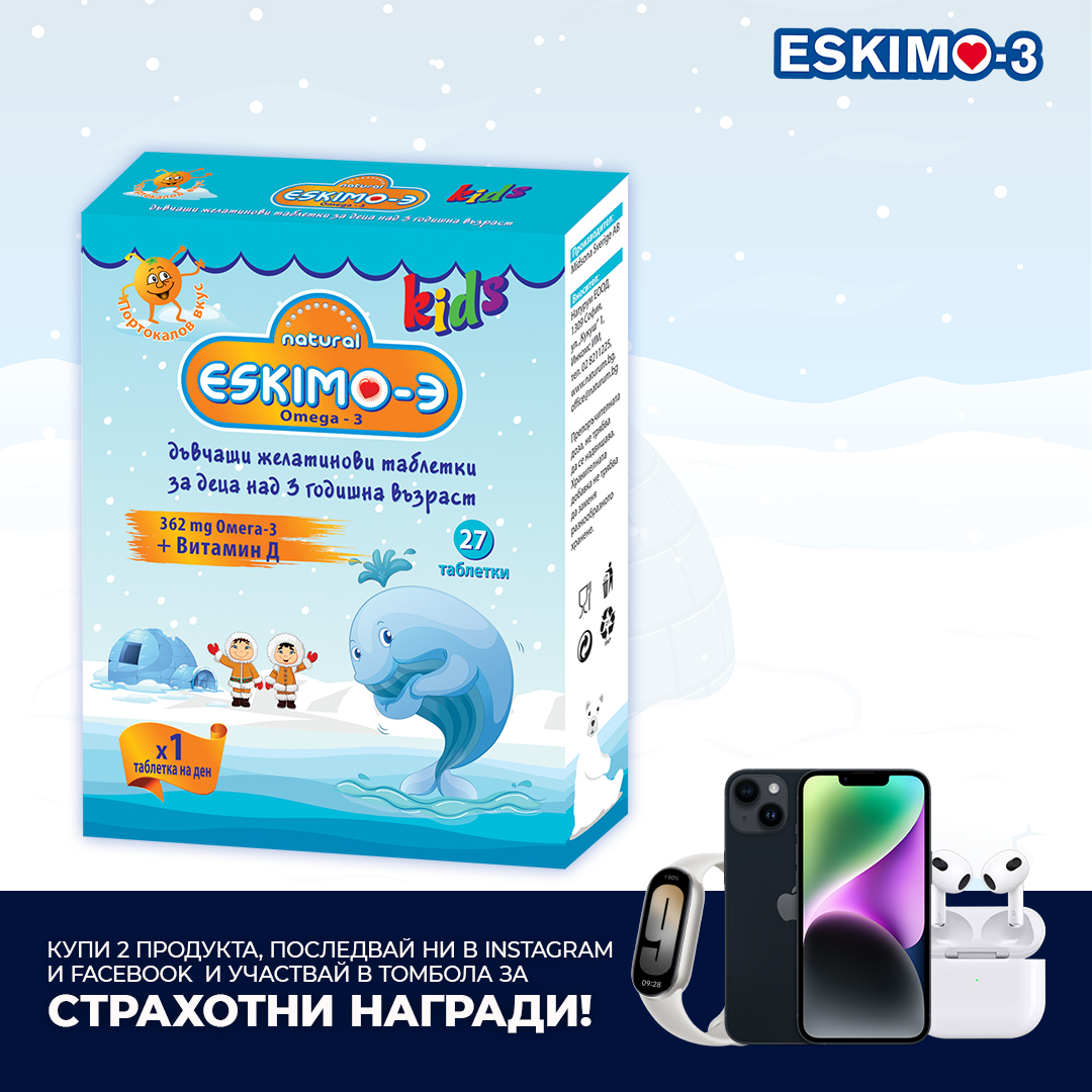 Ескимо-3 дъвчащи таблетки за деца са богати на омега-3 мастни киселини с високо съдържание на EPA и DHA. Продуктът е под формата на желеобразни таблетки, които се дъвчат, с приятен за деца вкус и аромат на портокал. Специално подбрана и обогатена комбинация от рибено масло с високо съдържание на омега 3 мастни киселини – EPA и DHA, обогатена с холин и биотин, подпомагащи развитието на дейността на нервната система. Недостигът на биотин може да доведе до изява на неврологични нарушения. Предлага се в опаковка от 27 дъвчащи таблетки.